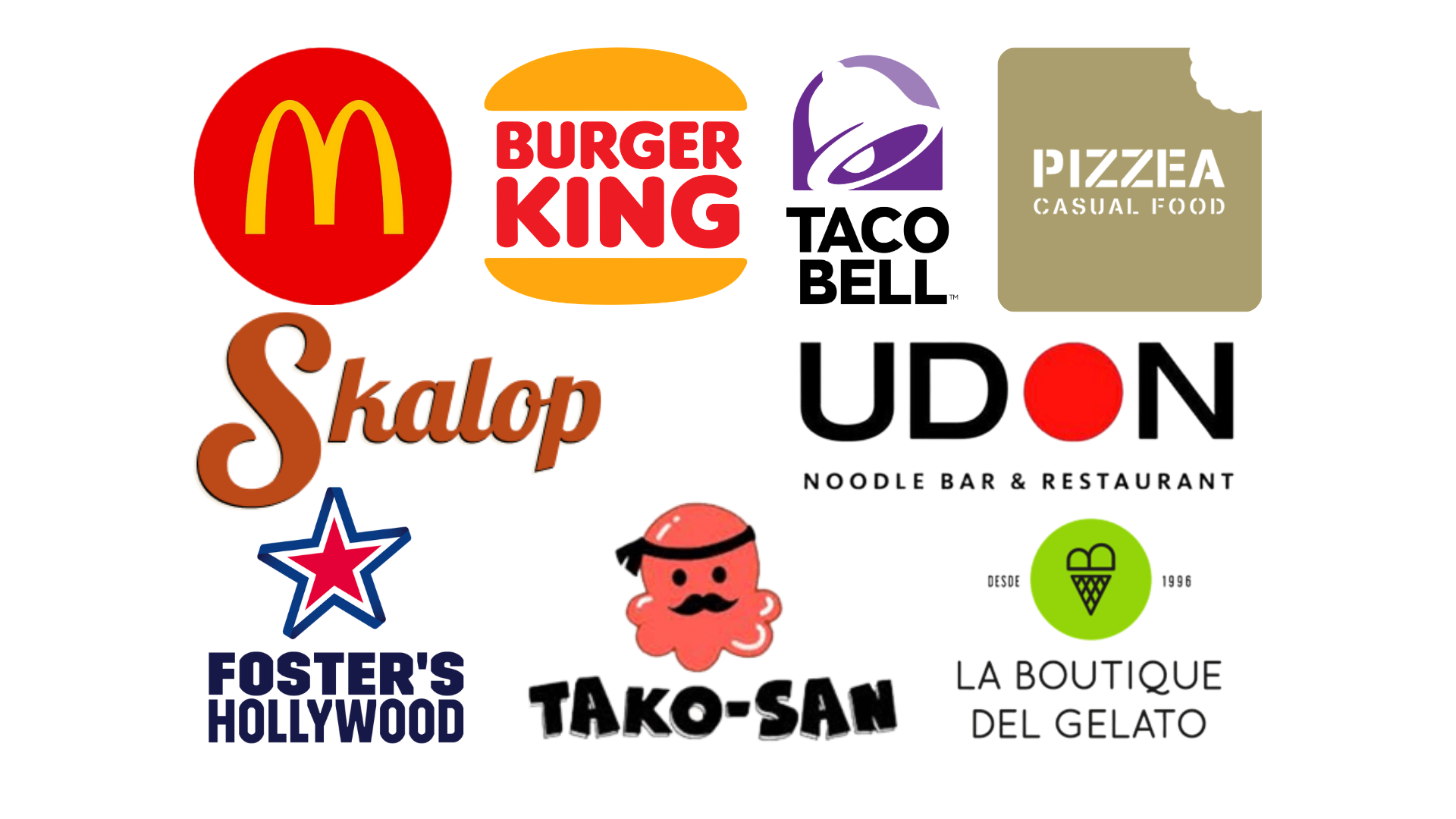 McDonald’s, Burger King, Taco Bell, Skalop, Foster’s Hollywood, Udon, La Boutique del Gelato, Pizzea Casual Food, Tako-san, entre otros.